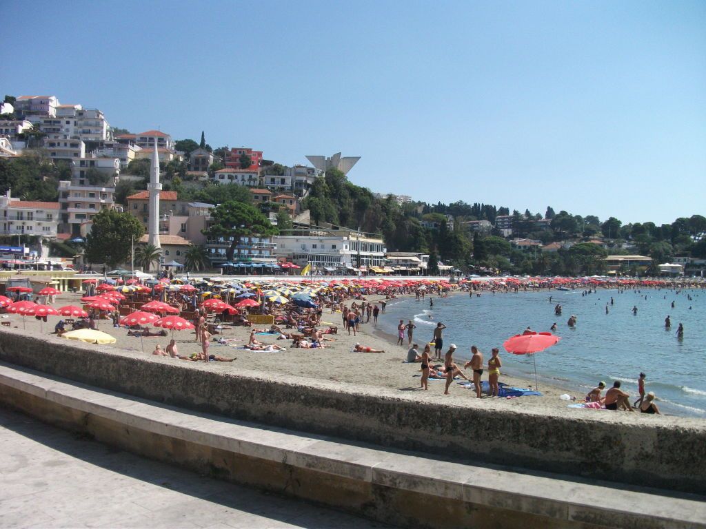 Er gibt dem Meer eine dunkle, blaugrüne Farbe. Typisch für diesen Strand ist sein flacher Grund, der sich weit ins Meer erstreckt. Deswegen und wegen des schönen Sands ist er ausgesprochen kinderfreundlich. Der Kleine Strand ist 360 m lang und bietet etwa 2.500 Gästen ausreichend Platz zum Baden. Am Strand, unterhalb der Altstadt, deren Mauern direkt aus dem Meer aufzutauchen scheinen, liegt der kleine Hafen Ulcinj (360 m) mit einer hübschen Anlegestelle. Hinter dem Strand befinden sind zahlreiche Restaurants, Bars und Cafés, die zum Verweilen einladen. Etwas weiter im Hinterland liegt stufenartig in mediterran-orientalischem Stil die Stadt Ulcinj, der südlichsten Punkt der Küste.